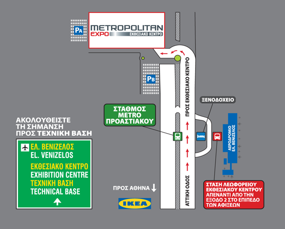 Το METROPOLITAN EXPO Εκθεσιακό Κέντρο βρίσκεται 2 Km από το Αεροδρόμιο «Ελευθέριος Βενιζέλος». Μπορείτε να μεταβείτε με το αυτοκίνητό σας μέσω της Αττικής Οδού προς το Αεροδρόμιο «Ελευθέριος Βενιζέλος», ακολουθείτε τη σήμανση προς Αεροδρόμιο και στη συνέχεια τη σήμανση προς Τεχνική Βάση και Εκθεσιακό Κέντρο.