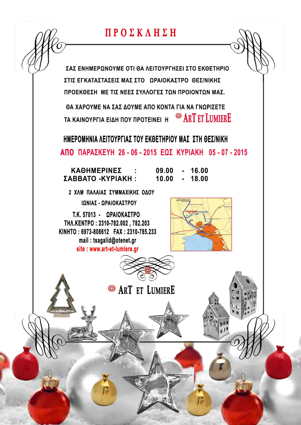 ΤΣΑΓΚΑΛΙΔΗ Α. & ΣΙΑ ΕΕ - ΤΕΧΝΗ & ΦΩΣ - ART ET LUMIERE. 2ο χλμ. Παλαιάς Συμμαχικής Οδού Ιωνίας – Ωραιοκάστρου, Τ.Θ. 226, 57013 Θεσσαλονίκη, Τηλ.: 2310 782002, 2310 782203, Fax: 2310 785223, e-mail: This email address is being protected from spambots. You need JavaScript enabled to view it., This email address is being protected from spambots. You need JavaScript enabled to view it., http://www.art-et-lumiere.gr